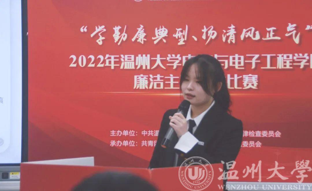 为深入学习贯彻党的二十大精神,持续推动党史学习教育走深走实,引导广大学生学习老一辈革命家、优秀共产党员艰苦奋斗、清正廉洁的品格,助推“清廉温大”建设,成人网站 于2022年11月23日晚在南校1A-203举行第三届“学勤廉典型,扬清正风气”主题演讲比赛。本次比赛由成人网站 党委副书记曾蓓蕾、成人网站 学工办辅导员潘龙飞、余明新、陈海彤、屠昌浩老师担任评委。程佳聪同学主持,各班代表现场参与此次活动,2022级全体新生线上观看了比赛。