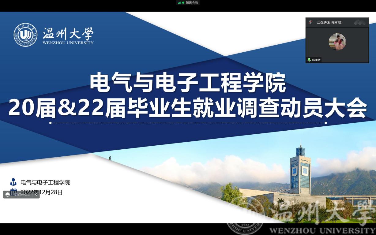 12月28日下午2:00,成人网站 召开20届与22届毕业生就业调查动员大会线上会议。副院长陈孝敬、党委副书记曾蓓蕾、电气系主任吴平、电子系主任庄友谊、学工办主任廖晓安以及20届与22届各毕业班班主任参会,会议由学工办就业辅导员屠昌浩主持。