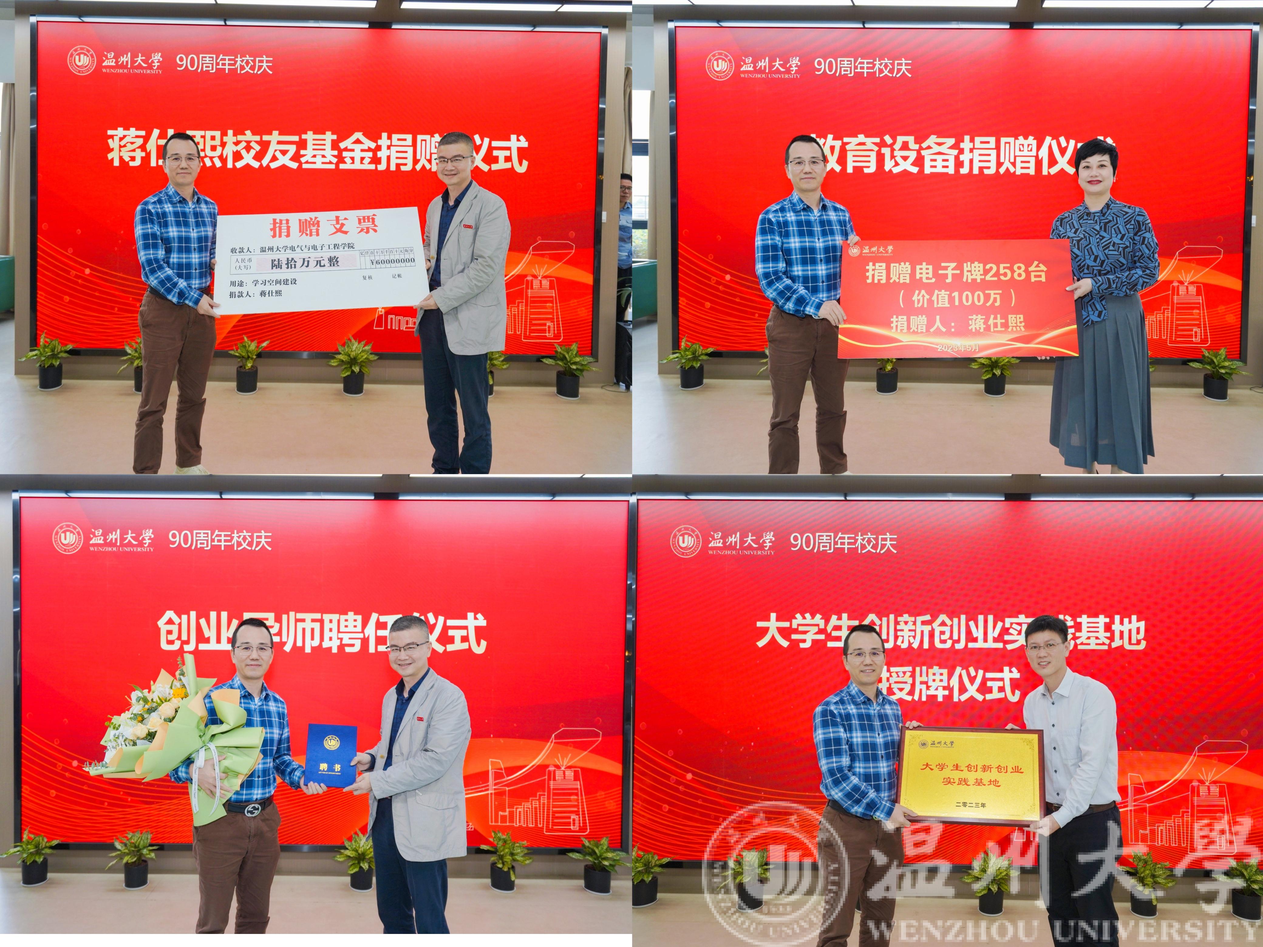 在现场各位嘉宾的共同见证下,蒋仕熙校友与李方强书记和张若妤处长进行了隆重的基金捐赠与教育设备捐赠仪式。与此同时,成人网站 还聘请蒋仕熙校友担任我校创业导师,并授予蒋仕熙校友的企业为我校大学生创新创业实践基地。