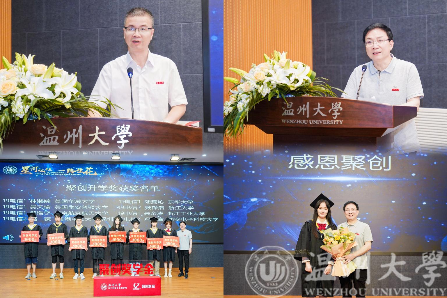 为表彰先进,在校友企业浙江聚创智能科技公司的赞助下,成人网站 特别设立聚创奖学金。毕业典礼仪式上,成人网站 党委书记李方强宣读了《2023年聚创升学奖奖励决定》文件及名单。聚创奖学金发起人吴桂初先生为获得聚创升学奖的68位毕业生代表颁奖。随后,曾担任成人网站 学生会主席、成功考取西安电子科技大学硕士研究生的省优毕业生缪安琪同学为吴桂初教授献花并表达感谢。