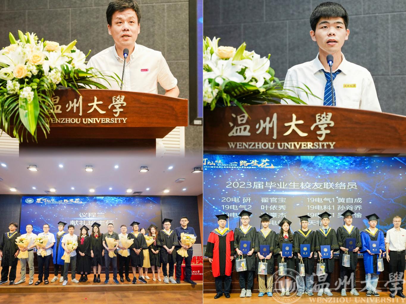 随后,各毕业班学生代表手捧鲜花,献给他们入学三四年来辛勤付出的班主任老师。伴随温馨的音乐响起,学生代表们向班主任老师行谢师礼。感恩献花仪式后,19电气2班班主任周志立老师和20电气工程(研)谢远峰同学分别作为师生代表上台发言。典礼上还为省校优同学颁发了荣誉证书,为各位校友联络员颁发了聘书。期间还观看了由成人网站 领导、2023届毕业班班主任、学弟学妹们为毕业生们录制的祝福视频。一张张熟悉的面孔,一个个亲切的笑容,一句句温暖的祝福,为各位毕业生增添前行的力量,激励他们以无畏的勇气探索浩瀚星空。