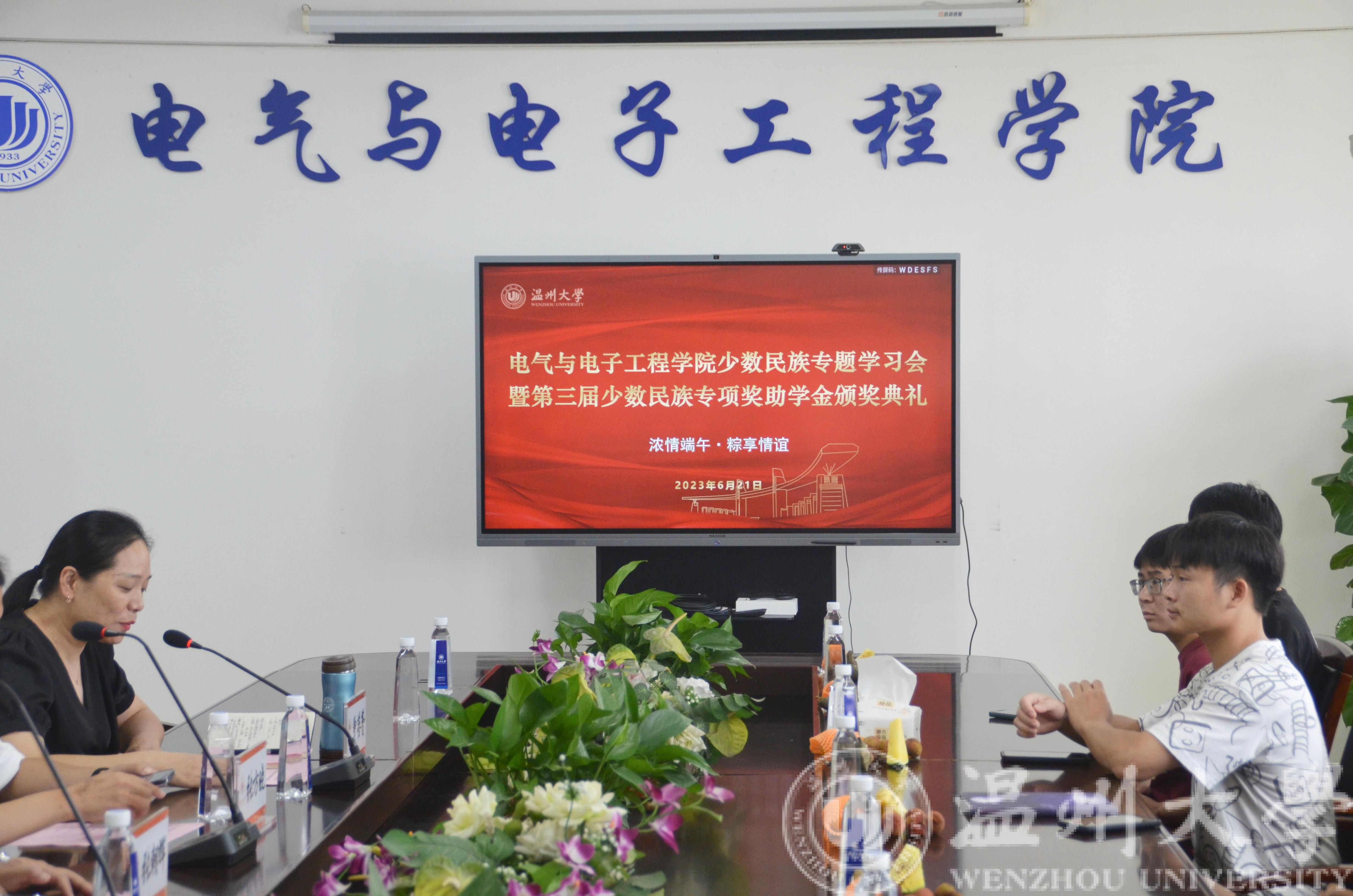 每年的农历五月初五,是中华民族传统的节日——端午节。为了弘扬优秀传统文化,增强民族团结和校友情谊,6月21日下午14:00,电气与电子工程成人网站 在1A-502举办少数民族专题学习会暨第三届少数民族专项奖助学金颁奖典礼。成人网站 2001级校友张方晓,学生部副处长张朝辉,学生部新疆内派教师赵雨菲、学工办辅导员陈海彤以及成人网站 少数民族同学出席本次颁奖典礼。本次颁奖典礼由成人网站 党委副书记曾蓓蕾主持。