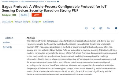 物理不可克隆函数(Physical Unclonable Function, PUF)是一种新型的硬件安全原语,通过提取集成电路制造过程无法避免引入的随机工艺偏差,可产生具有随机性、唯一性和防篡改特性的特征密钥。基于PUF的设备认证协议相较于基于传统加密和密钥管理的认证方法具有更高的安全性和鲁棒性。针对物联网设备认证协议开销与性能无法兼顾的技术瓶颈,我校汪鹏君教授团队提出一种面向物联网感知设备的全流程可配置安全认证协议,该协议的核心加密算子源于我国传统五子棋局八卦阵。协议针对不同设备配置不同八卦矩阵的加密方式,以提升强PUF的抗机器学习攻击能力和协议的抗重放暴力攻击能力,从而最大限度地降低敏感数据泄露的风险。通过搭建自主测试平台,验证该协议可极大提升感知设备的全流程安全,并能够优化感知层资源的分配效率。