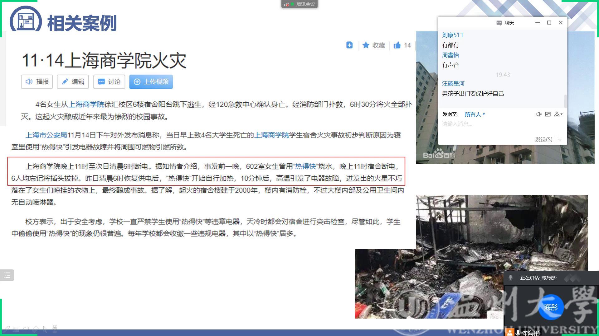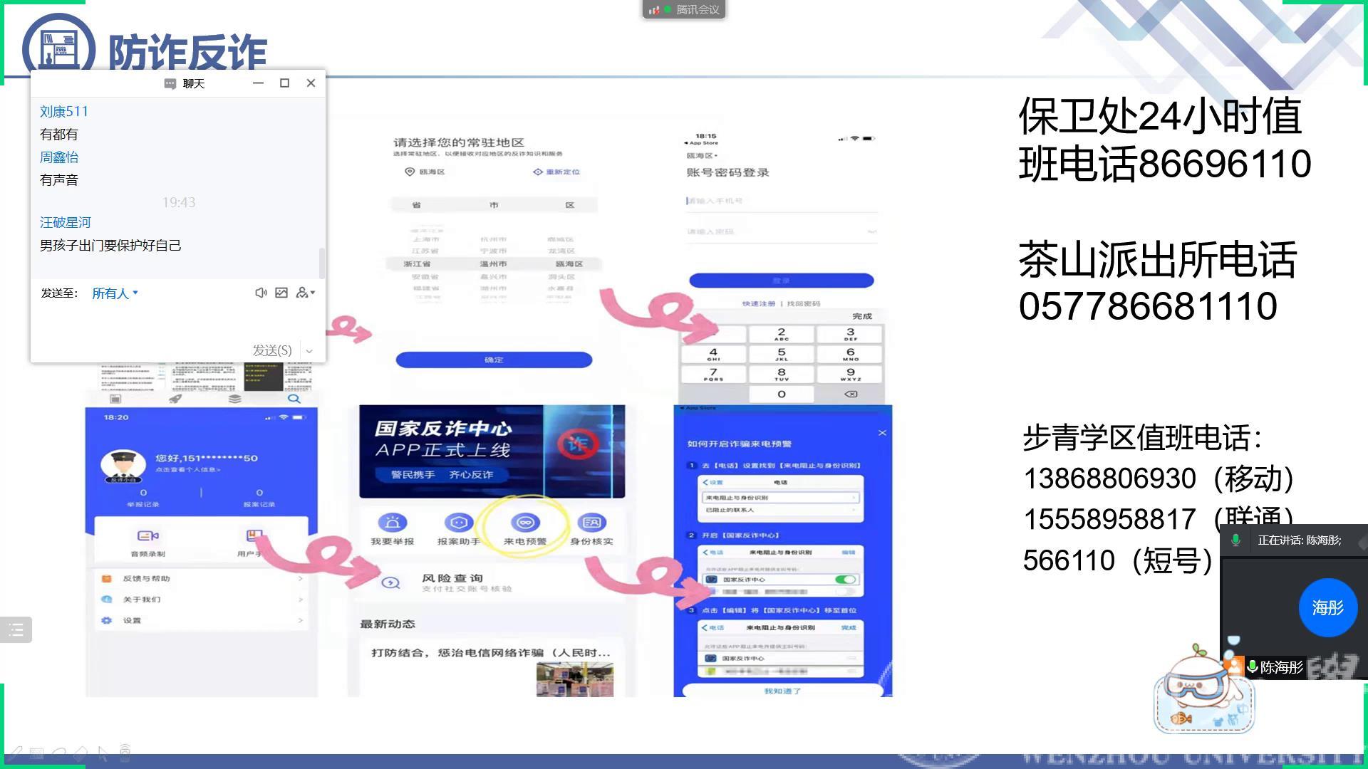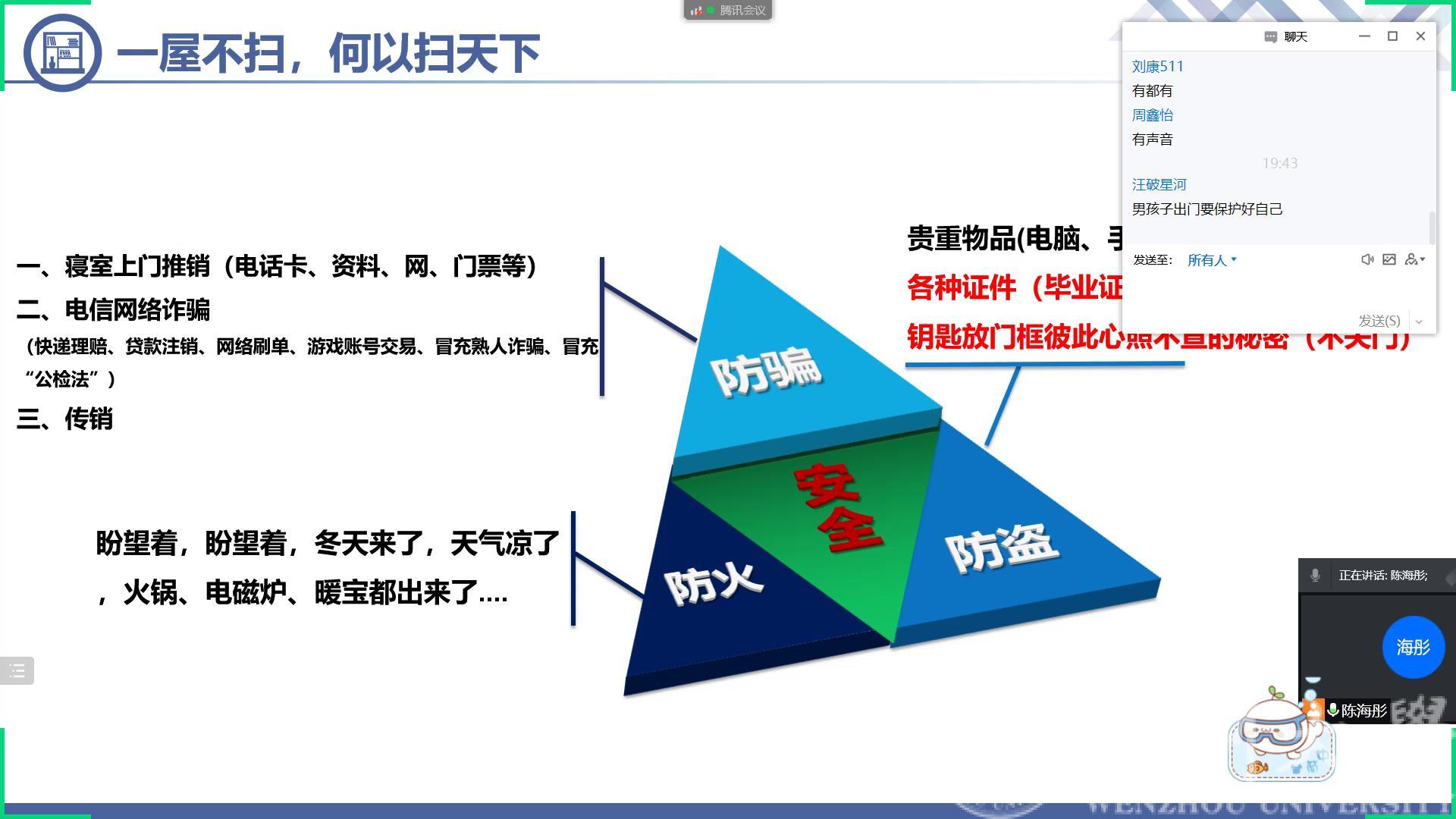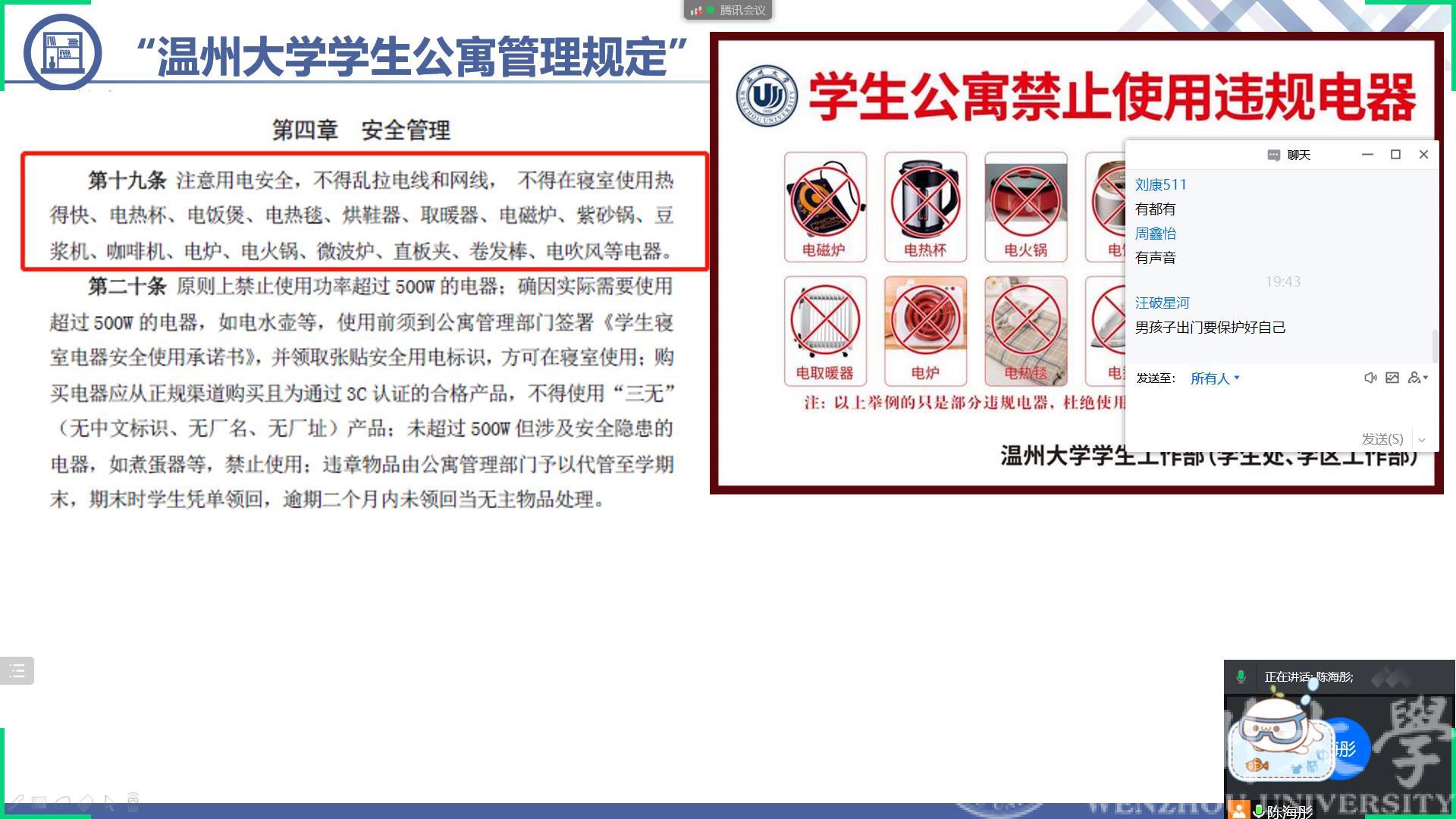 2月21日晚上19:30,成人网站 召开全体寝室长线上会议。会上公寓辅导员陈海彤老师从寝室卫生管理、公寓安全管理、防诈反诈、寝室关系、宗教政策以及心理健康方面进行讲解,重点讲解了学校的公寓管理规定。另外陈老师就宿舍人际关系进行讲解,希望同学们能够珍惜在寝室的情谊;同时寝室长要积极参与心理健康相关的培训,关注寝室同学的心理状态以及日常考勤,有情况及时和辅导员反馈。