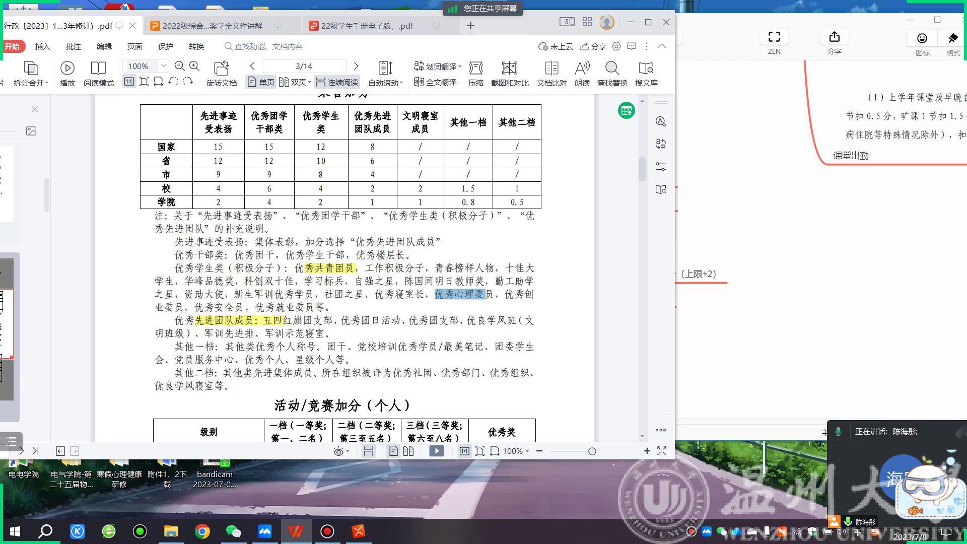 为做好2022级本专科生综合评价项目的信息录入,落实“校级总纲+一院一策”,帮助同学们顺利完成综合评价项目赋分项的申请。2023年7月8日,成人网站 在线上召开2022级奖学金评定及综合评价文件讲解会议。会议由成人网站 分管评奖评优辅导员陈海彤老师主持,2022级学生参与。