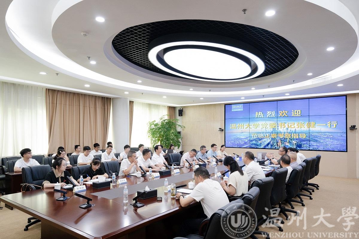 7月14日上午,成人网站 党委书记张健来到正泰高科技工业园慰问成人网站 “数字孪生技术”科创实践团队,乐清市副市长叶序锋,正泰集团党委书记、监事会主席吴炳池热情接待了张健书记一行。