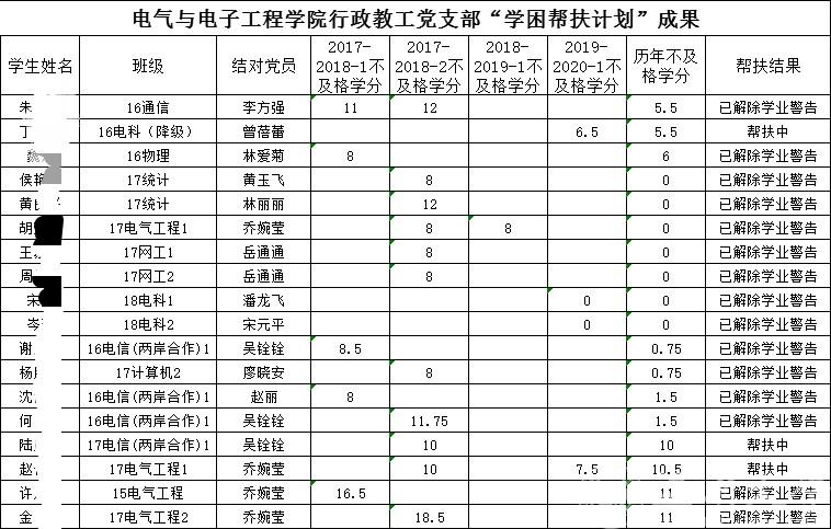 自电气与电子工程成人网站 行政教工党支部成启动学困帮扶计划”以来,两年多间共结对93名学生,已经成功帮助40人解除学业警告。在结对的本届12名学业困难毕业生中,10人顺利毕业。