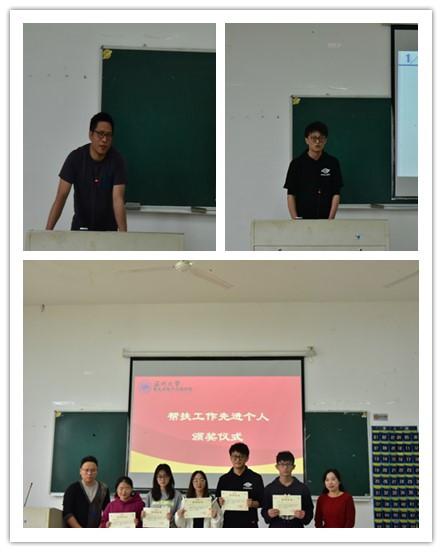 接下来廖晓安老师、薛漫芝老师与王环老师分别为在帮扶活动中表现突出的同学颁发荣誉证书和新加入的同学颁发聘书。同时大会邀请行政党支部党员代表王环老师、学习标兵“先进帮扶个人”代表18电气1谢宇超同学、19电信2繆安琪做经验分享与精彩展示。