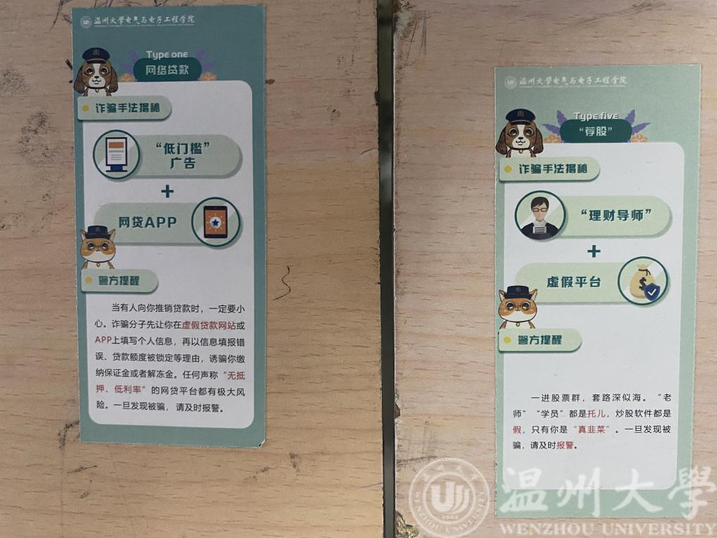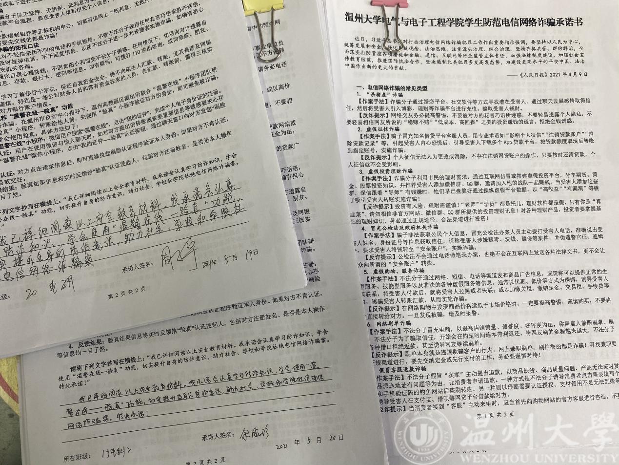 5月以来,成人网站 开展“防诈安全宣传月”活动:以成人网站 为单位在教室及成人网站 公共区域粘贴防诈小贴士;以班级为单位召开主题班会;以宿舍为单位集体学习防诈宣传单;以个人为单位签署防诈承诺书等。自活动开展以来,成人网站 学工办各辅导员充分抓住各个机会对学生进行防诈安全教育:深入疫苗接种现场进行防诈APP推广、通过班主任会议详细进行“验证”小程序教学、利用学生干部抓手强化反诈骗意识宣传。