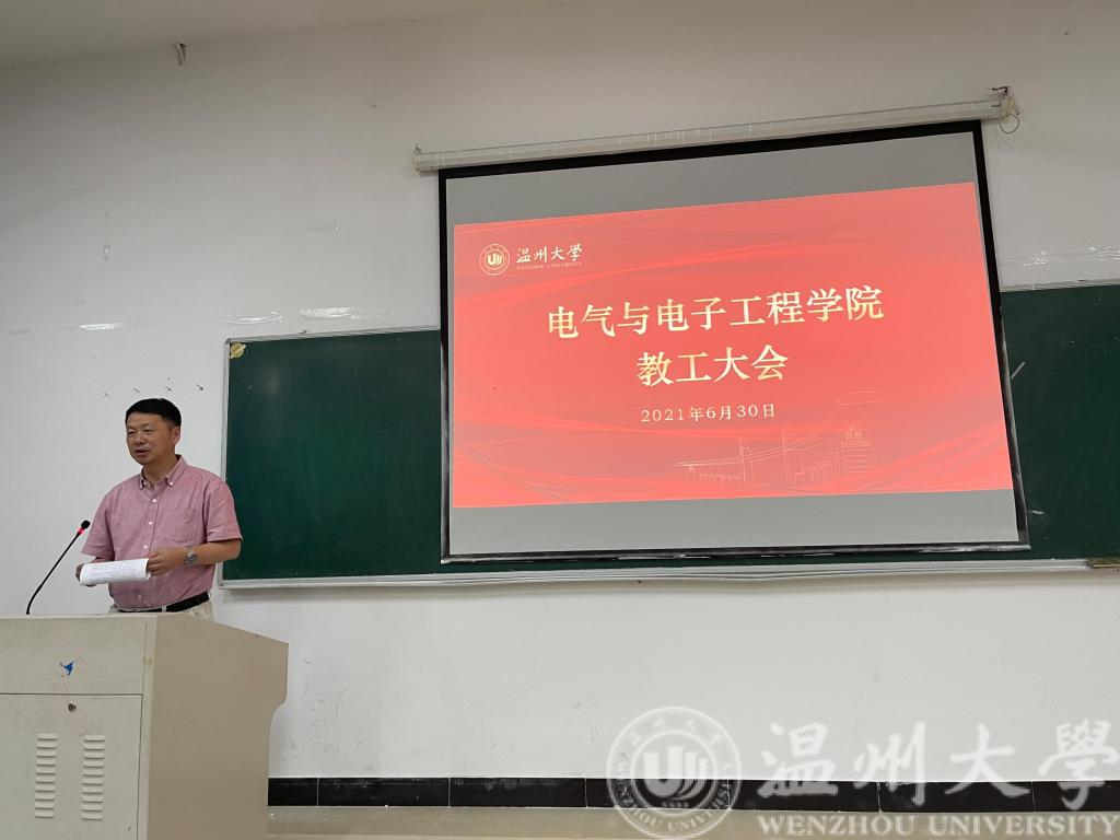 6月30日下午,电气与电子工程成人网站 在1B402召开全体教职工大会暨干部考核民主测评会。会议由成人网站 党委副书记曾蓓蕾主持,全院教职工参加会议。