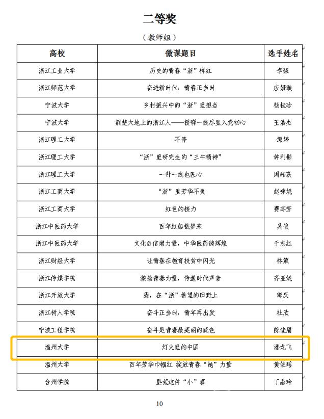 近日,由共青团浙江省委、浙江省教育厅、浙江省学生联合会主办的2020年度浙江省高校思政微课大赛获奖名单公布,成人网站 辅导员潘龙飞老师的思政微课作品《灯火里的中国》荣获此次微党课大赛二等奖。