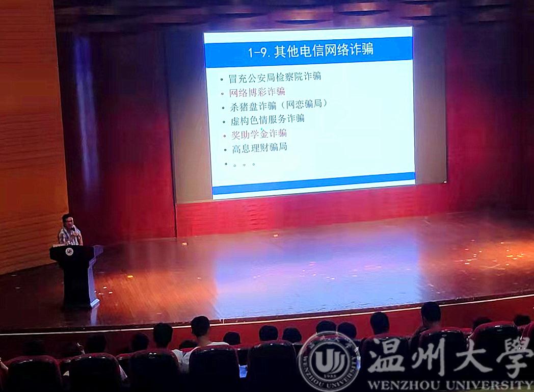 首先由我校保卫处的王奇志老师对包括食品安全、消防安全、网络安全及校园诈骗等一系列可能在校园内发生的安全隐患进行介绍,让各位新生熟悉和了解学校公寓管理等相关规定;同时对一些常见的诈骗类型进行介绍。