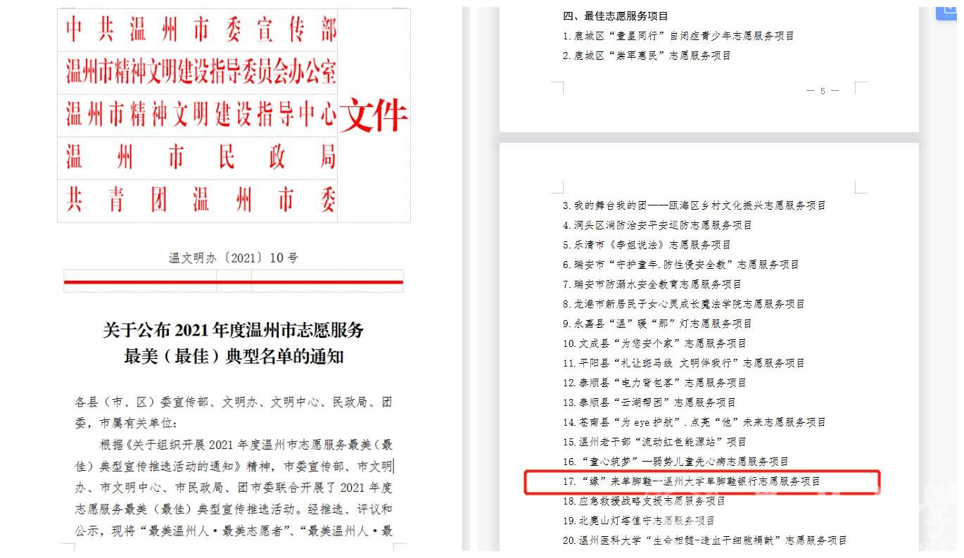 2021年度温州市志愿服务最美(最佳)典型名单于11月25日公布,经过成人网站 推荐、社会评议,成人网站 “单脚鞋银行”师生志愿者服务项目荣获温州市最佳服务项目奖。