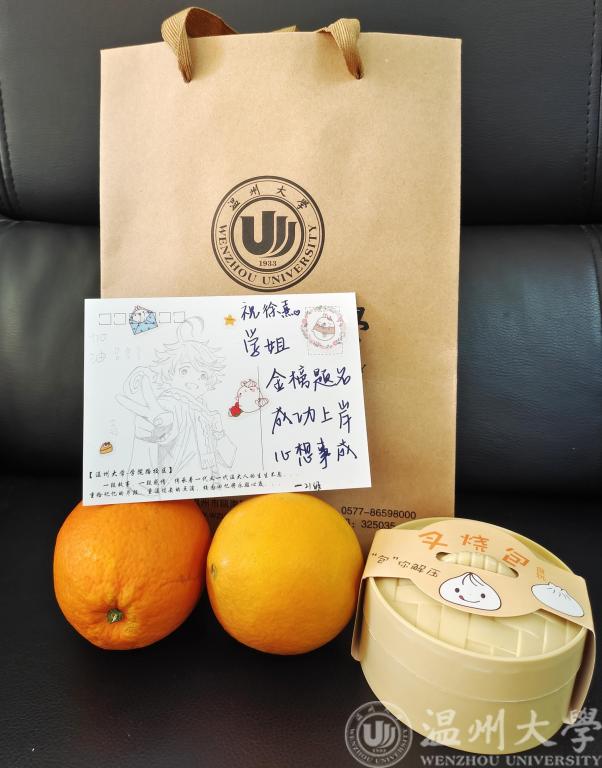 脐橙寓意着“脐”开得胜,心想事“橙”;“白白胖胖”的解压包子捏捏乐让考研学子能够缓解焦虑,释放压力;专属明信片传达了学弟学妹们对考研学子的崇拜与祝福,也在新生们心中悄悄种下考研的种子。
