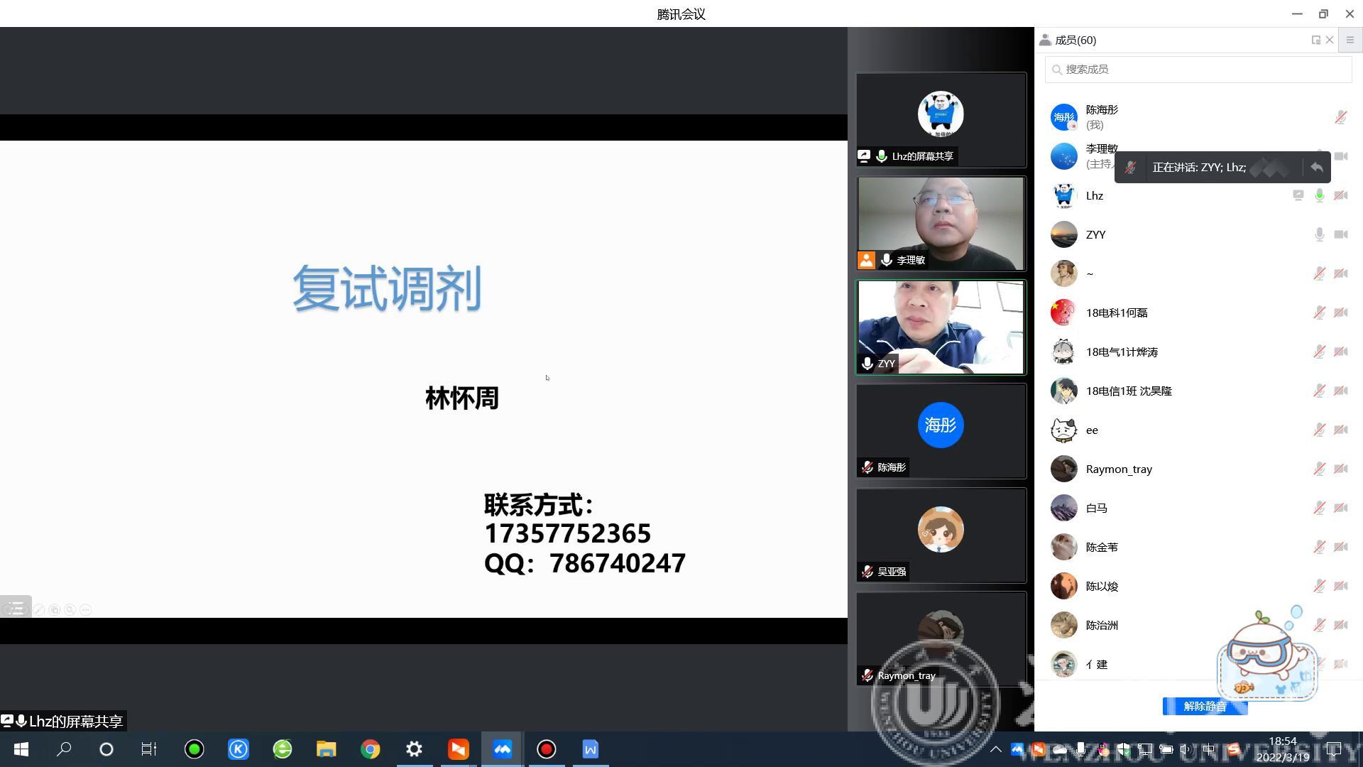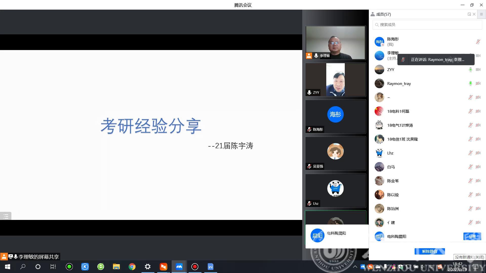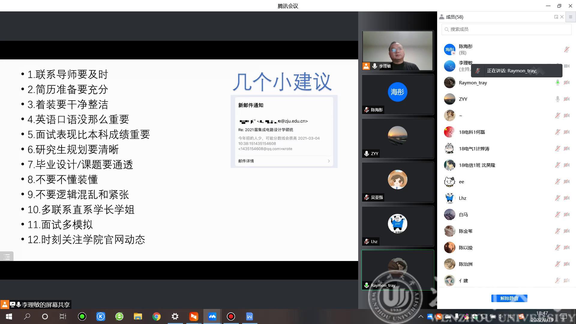 为进一步助力2022年考研学子顺利上岸,打通研途最后一公里,3月19日晚上18:30,成人网站 在线上举行了2022年考研复试及调剂经验分享会。本次分享会分别邀请到目前就读于浙江大学的陈宇涛同学以及桂林电子科技大学的林怀周同学为大家进行考研复试及调剂经验分享。会议由成人网站 电子系主任李理敏老师和庄友谊老师主持,2018级班主任和2022年考研学子参加了此次分享会。