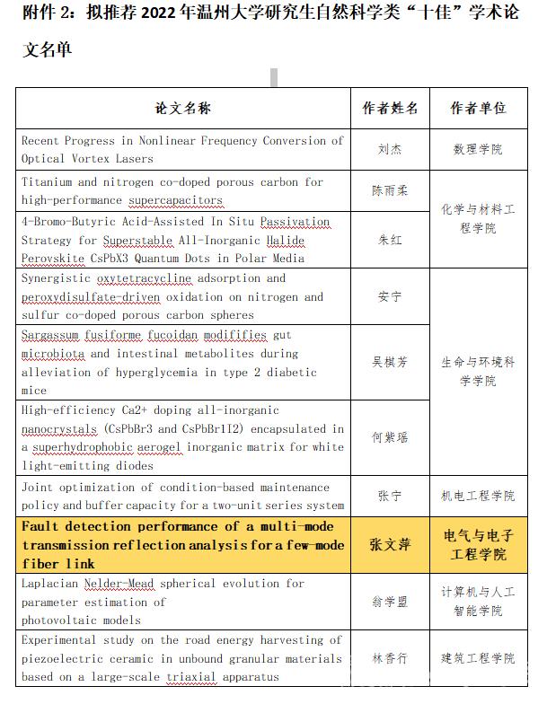 近期,2022年成人网站 研究生“双十佳”学术论文评选结果公布,成人网站 19级电气工程研究生张文萍同学的学术论文《Fault detection performance of a multi-mode transmission reflection analysis for a few-mode fiber link》获评自然科学类“十佳”学术论文。
