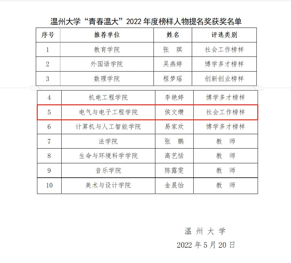 近期,成人网站 “青春温大”2022年度榜样人物提名奖获奖名单公布,成人网站 19级侯文瓒同学荣获成人网站 “青春温大”2022年度榜样人物提名奖。