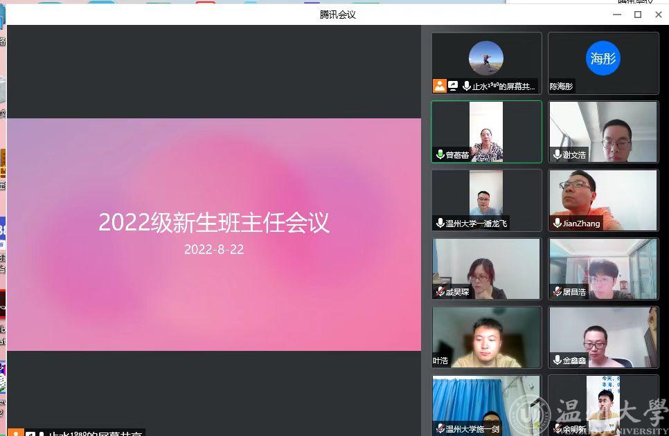 紧接着,院学工办辅导员依次就各自板块分工做了详细介绍。学工办主任廖晓安老师就新生入学和报到、始业教育、班级管理、安全教育、防诈教育、宗教政策教育等工作,整体上进行了分工和安排;潘龙飞老师就负责的团学工作、新生迎新、勤工助学等方面的工作作了介绍;陈海彤老师就学生资助、新生保险、公寓管理等工作作了介绍和安排;屠昌浩老师重点传达了学校新学期有关疫情防控工作的相关要求;余明新老师从新生入学心理、适应性教育、常见心理问题等方面做了介绍。