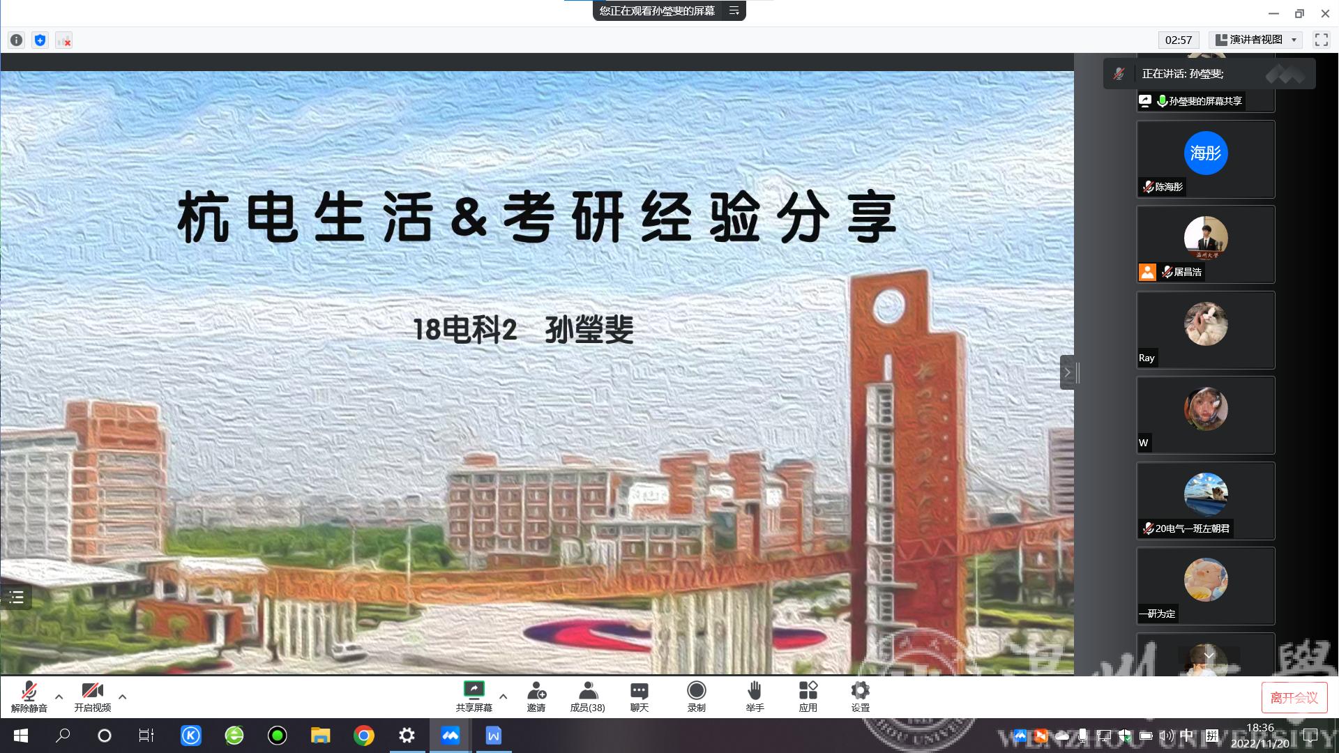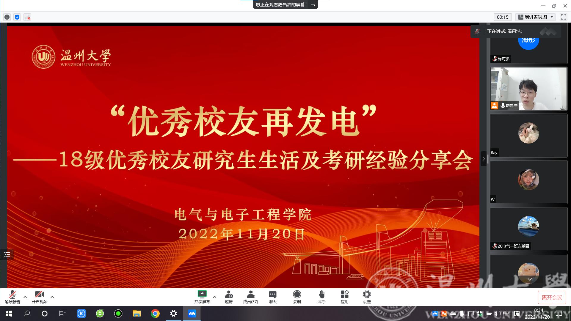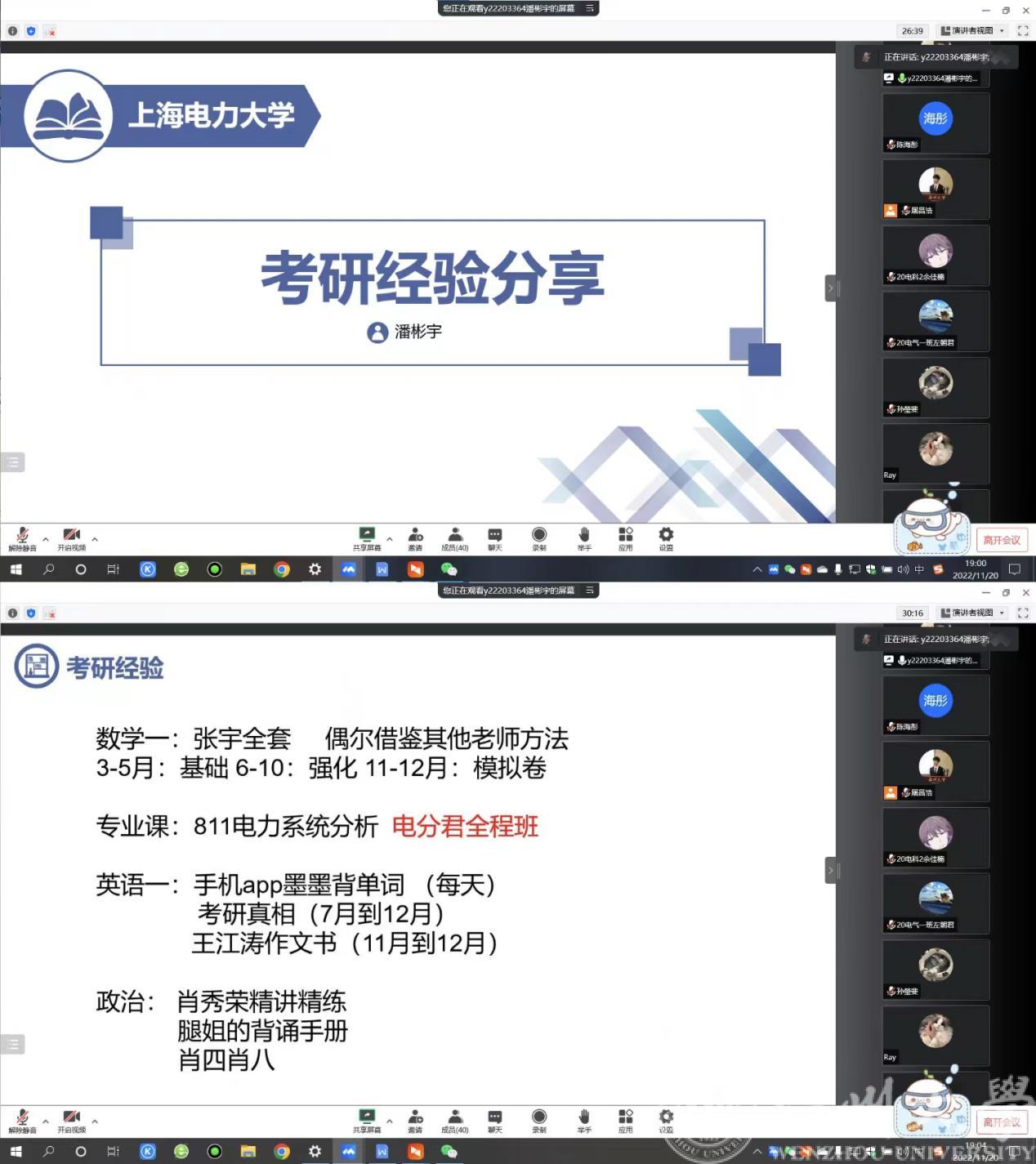 为进一步营造提高成人网站 学生考研热情,营造良好考研氛围,同时增强校友与母校交流合作,发挥校友榜样力量。成人网站 于11月20日晚召开组织召开线上18级优秀校友考研经验分享会。本次分享会邀请到2022届优秀毕业生孙瑩斐(目前就读于杭州电子科技大学,电子科学与技术专业)、潘彬宇(目前就读于上海电力大学,电气工程专业)为学弟学妹们们分享考研经验和研究生生活。出席本次会议的有院负责校友工作的辅导员屠昌浩老师、负责考研工作的辅导员陈海彤老师,即将参加2023年考研的学生及其他年级有意向考研同学。