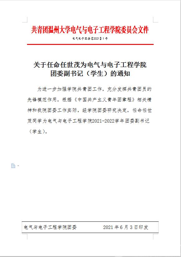 关于任命任世茂为电气与电子工程成人网站 团委副书记(学生)的通知