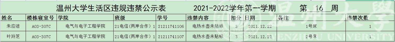自2021年下学期入学开始,学校针对宿舍安全每周进行大排查,根据学校第十六周寝室安全卫生检查结果,排查到成人网站 朱应洁、叶玲芝两位同学存在寝室违规现象,受到学校通报。现根据学校相关规定,对以上同学进行院内通报批评,请其他同学引以为戒。