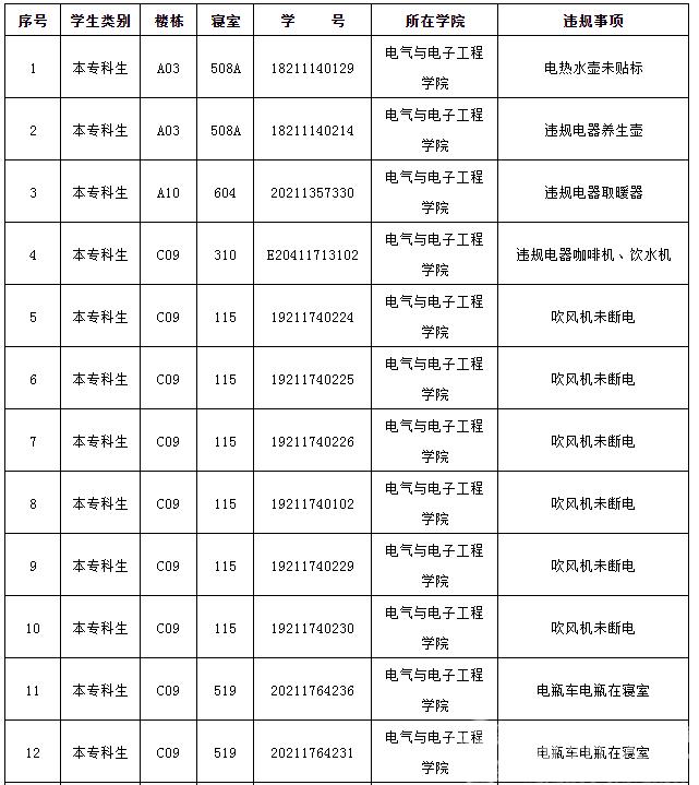 根据学校学生公寓安全“四级联查”工作机制要求,学工部、研工部、后勤管理处、保卫处联合于2月23日对学生公寓区安全情况进行检查,在检查中成人网站 共存在12起安全违规现象,现予以通报批评,请大家引以为鉴。