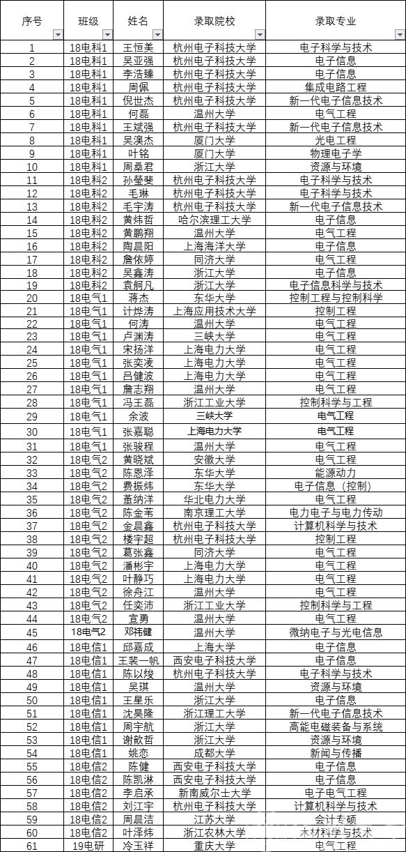 根据《电气与电子工程成人网站 “聚创奖学金”评定办法》文件精神,结合成人网站 实际,成人网站 将本年度考取硕士研究生、博士研究生及出国留学的61名同学直接评定为第三届“聚创奖学金”升学奖获得者,现将名单予以公示,公示三个工作日,如有异议请于公示期内与学工办联系,特此说明。