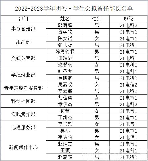 根据团委学生会干事自愿报名以及成人网站 综合考虑,决定拟聘任以下同学为成人网站 2022-2023学年团委学生会部长: