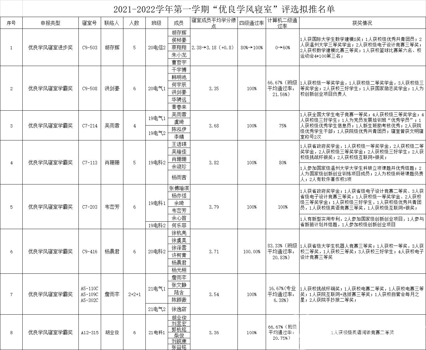 为进一步加强院风学风建设,发挥优秀寝室树立的导向和典型作用,引导和激励广大学生刻苦学习、立志成才,根据《电气与电子工程成人网站 优良学风寝室评选办法》规定,经各寝室申请,成人网站 初评,拟推荐 C9-503等8个寝室获得2021-2022学年第一学期“优良学风寝室”称号。现将拟立项名单给予公示