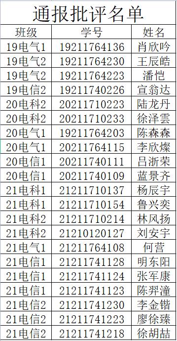 根据学校排查、成人网站 学工办核实,有以下同学没有遵守温州市和我校疫情防控要求:核酸检测间隔时长超72小时。根据《成人网站 新冠肺炎疫情防控期间学生纪律处分暂行规定》,结合成人网站 实际,给予以下同学全院通报批评。